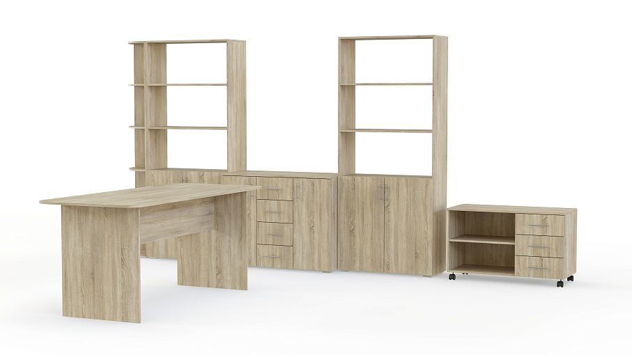 Доступен широкий выбор цветов для оформления корпуса и фасадов мебели, от белого, до насыщенного цвета венге. В комплект входит стол для конференций, тумба, комод, стеллаж и пенал. Мебель изготовлена из качественных материалов и фурнитуры. На протяжении срока ее эксплуатации, она не потеряет свой привлекательный внешний вид.