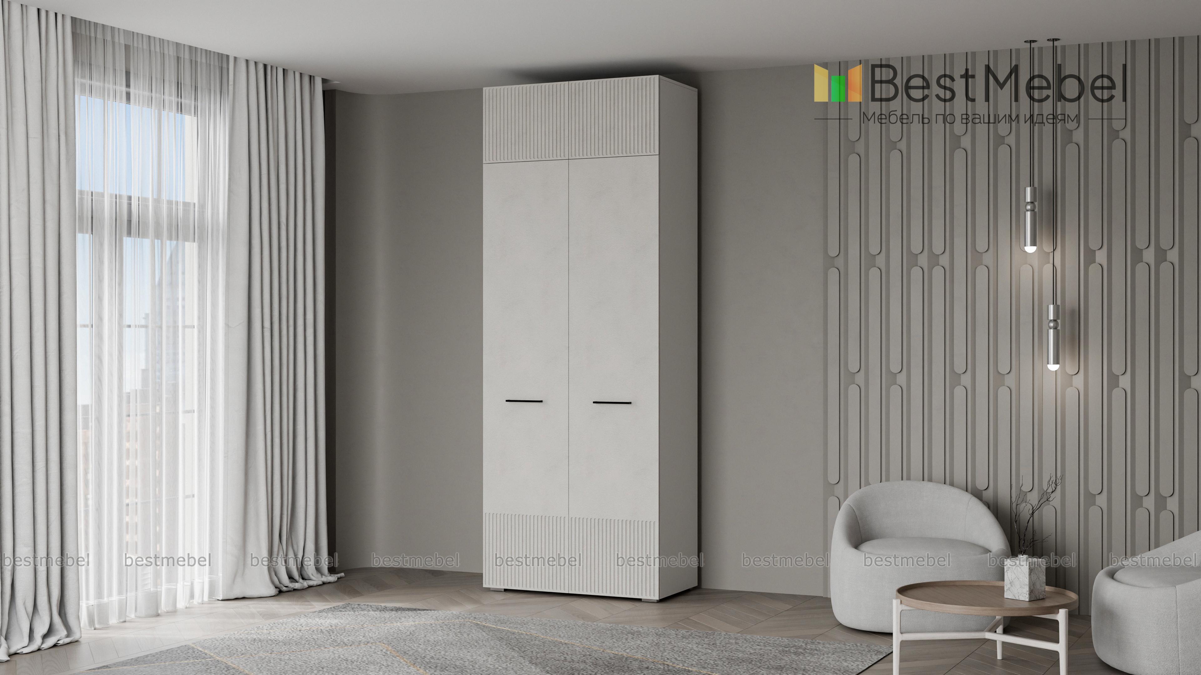 Шкаф распашной Декарт 8 BMS поможет быстро навести порядок в небольшой комнате. Двухдверный гардероб имеет базовое наполнение из штанги и верхней полки, а дополнительное пространство для хранения дает антресоль. Всегда актуально выглядит светлый фасад из МДФ с классической фрезерованной отделкой и контрастными поперечными скобами. Купить шкаф распашной Декарт 8 BMS в нужном размере и цветовой гамме приглашаем недорого на сайт нашего интернет-магазина.