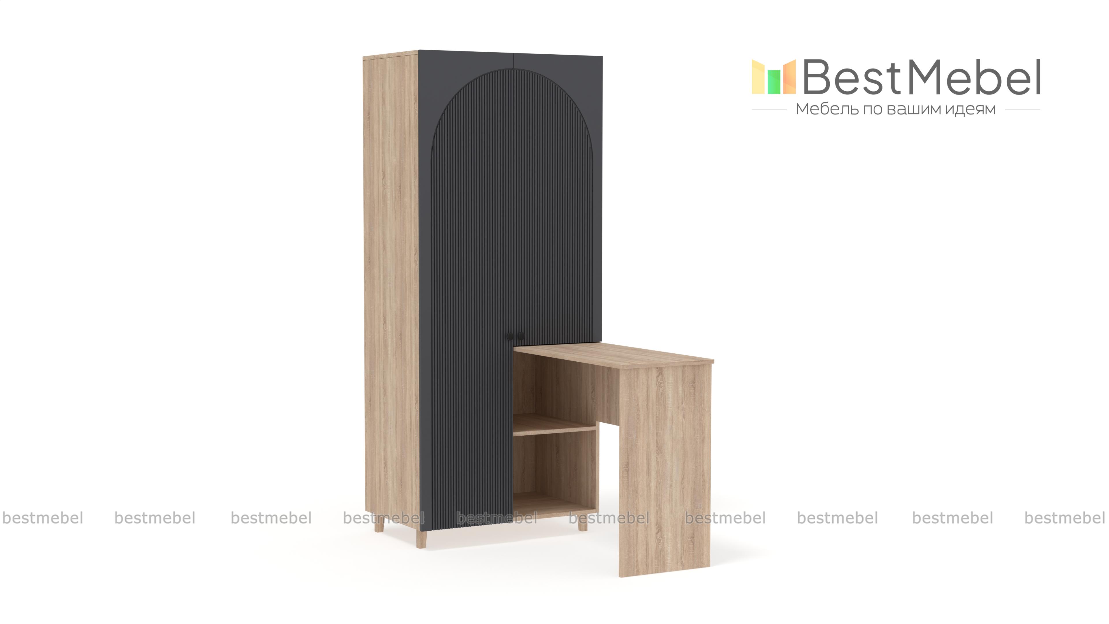 Шкаф со столом Вивьен 3 BMS — функциональная и стильная мебель в небольшую комнату. Угловая конструкция из распашного шкафа с двумя открытыми секциями и письменного столика объединила рабочую зону с удобной системой хранения. Качественные материалы обеспечивают этой модели надежность, а выразительный дизайн создают актуальные оттенки и стильная фактура фасада. Купить шкаф со столом Вивьен 3 BMS, изготовленный по вашим размерам, можно на сайте нашего интернет-магазина.
