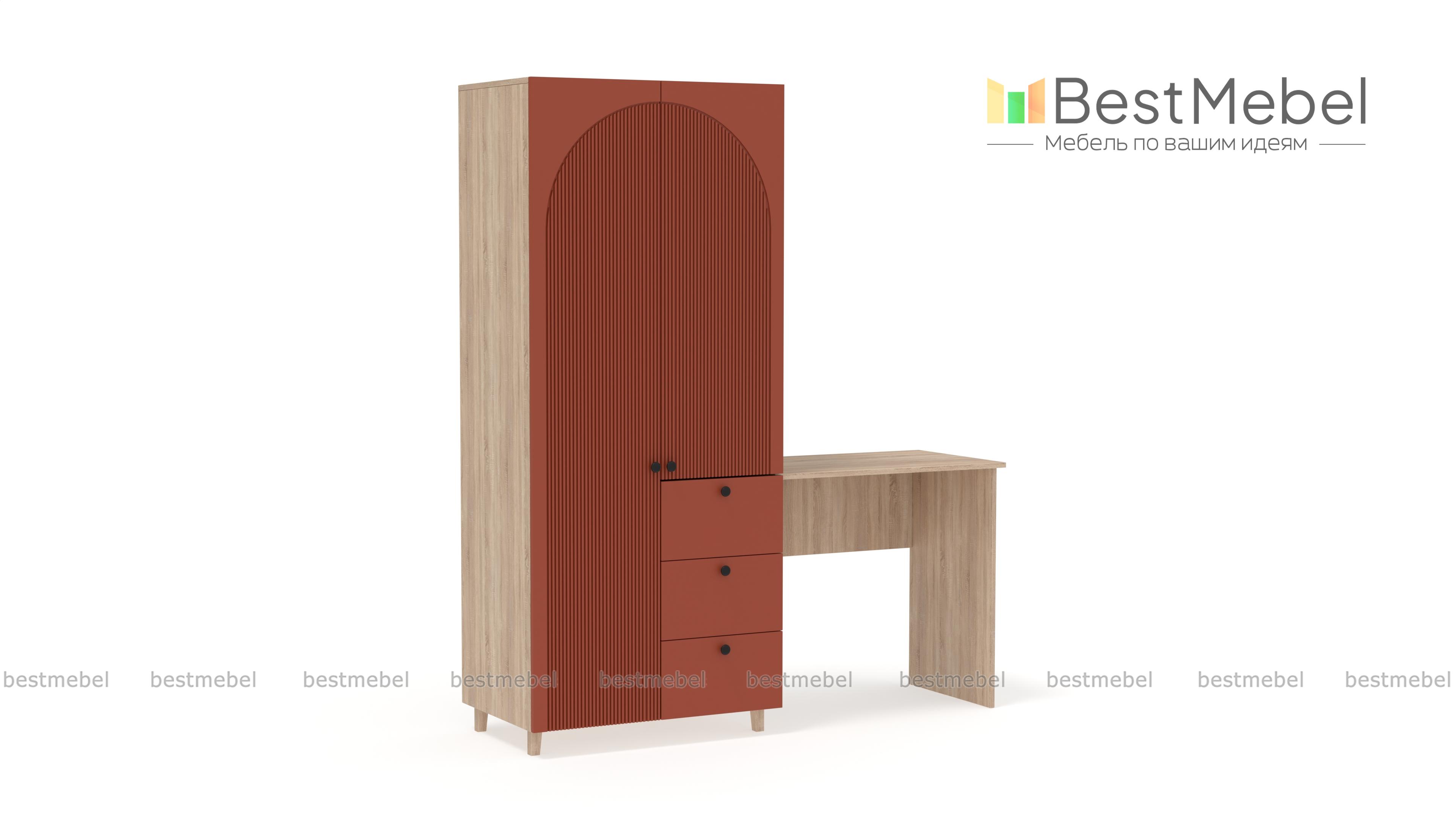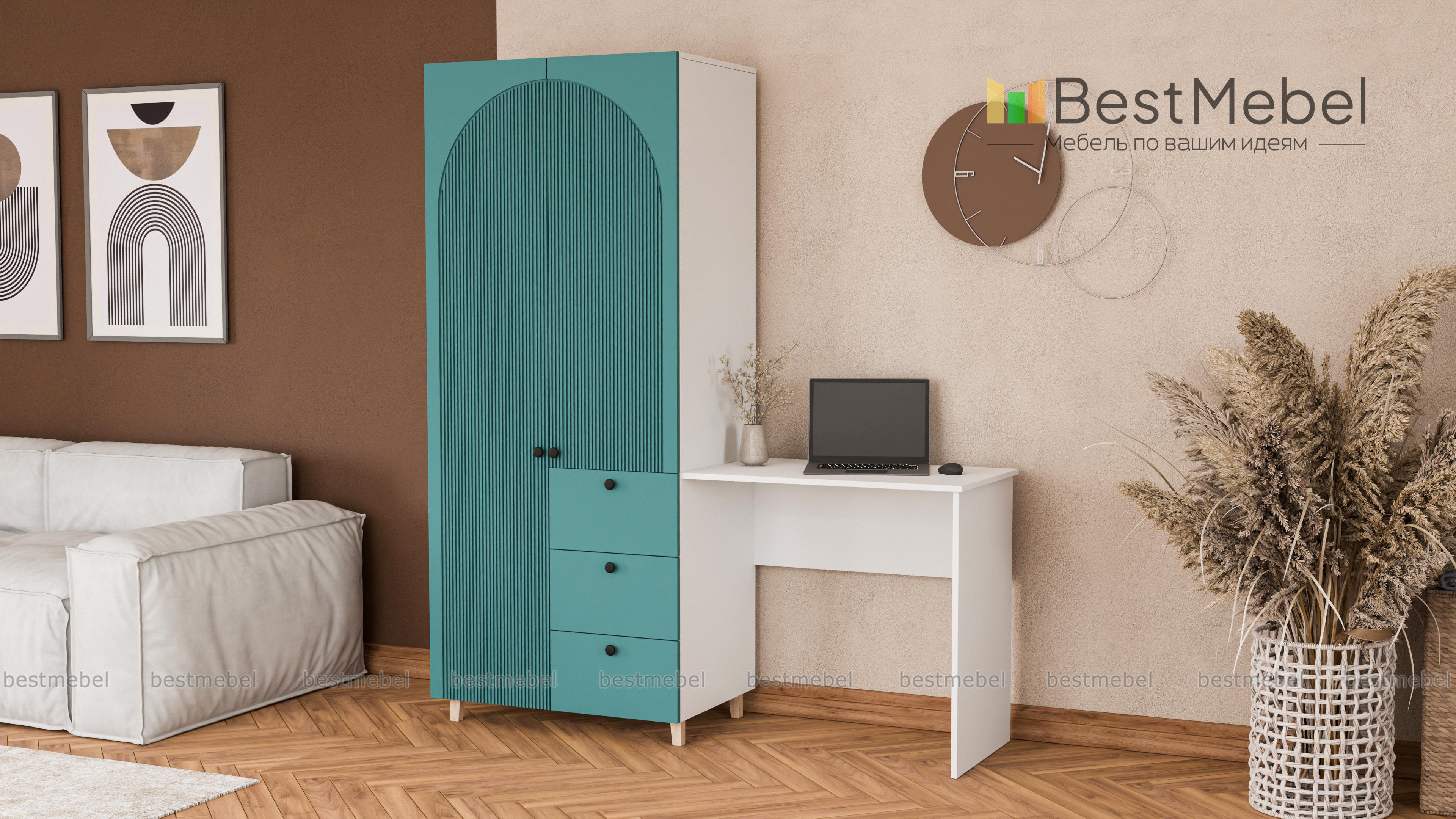 Шкаф со столом Вивьен 4 BMS значительно экономит пространство небольшой комнаты. Компактный гардероб с распашными дверцами и рядом из трех выдвижных ящиков объединен со столиком, удобным для учебы, работы и творчества. Стильный дизайн с высокими опорами, фрезерованной отделкой фасада и трендовыми оттенками украсит интерьер современной квартиры. Купить шкаф со столом Вивьен 4 BMS вы сможете в нашем интернет-магазине с изготовлением по индивидуальным размерам.