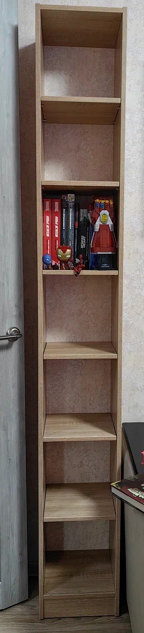 За свою стоимость прекрасный стеллаж! Есть пара недочетов: почему-то задняя панель не полностью вошла в паз, в итоге верхняя часть панели выпирала, решил укрепить её ножками (если это ножки), чтобы не вбивать гвозди, чтобы стеллаж был разборный. Также на одной из боковых частей была царапина, но так как целью является использовать его на балконе, то непринципиально.В планах также повесить жалюзийные дверки, петли уже вмонтированы, осталось покрыть дверки маслом/морилкой.Размер был взят на заказ, 900х208х580, за что отдельное спасибо!