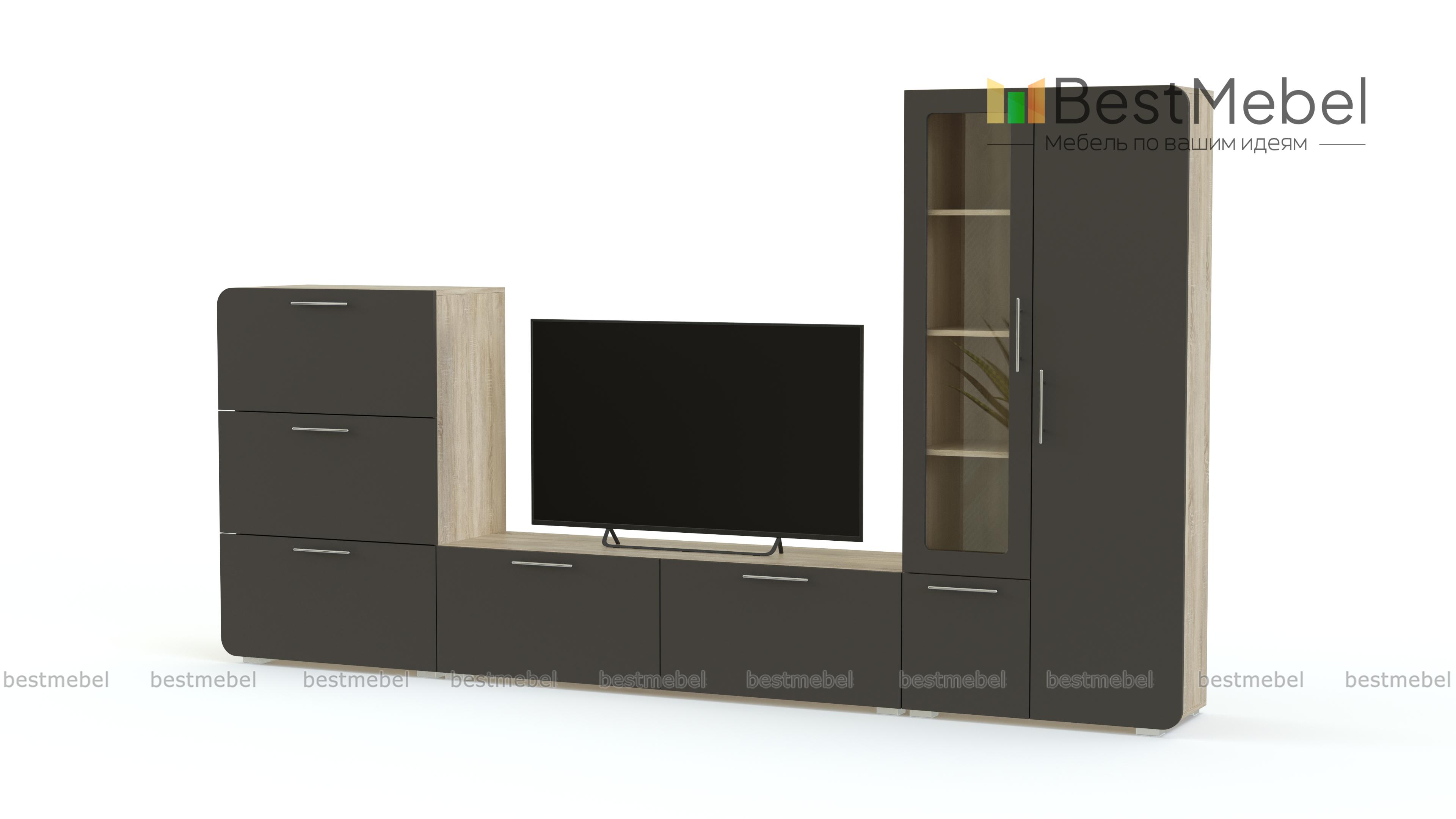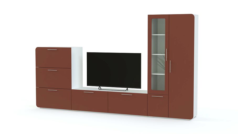 Стенка Модерно 14.1 BMS – компактная модель, которая отлично впишется даже в малогабаритные гостиные благодаря практичной модульной конструкции. В комплект входят низкая тумба для ТВ с просторной столешницей и двумя закрытыми отделениями, высокая тумба с выдвижными ящиками и комбинированный с застекленной витриной шкафчик. Расцветку для матовых скругленных фасадов вы сможете подобрать самостоятельно. Купить стенку Модерно 14.1 BMS приглашаем в наш интернет-магазин.