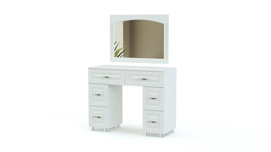 Туалетный стол Элизабет Композиция 2 BMS – это двухтумбовая модель с широкой столешницей, двумя большими и четырьмя малыми выдвижными ящиками. Дополненный навесным зеркалом в элегантной раме, столик сделает уход за собой комфортным и украсит спальный интерьер. Выполненная в универсальных светлых тонах, модель декорирована классической рамочной фрезеровкой и располагается на регулируемых пластиковых ножках. Купить туалетный стол Элизабет Композиция 2 BMS приглашаем в наш интернет-магазин.