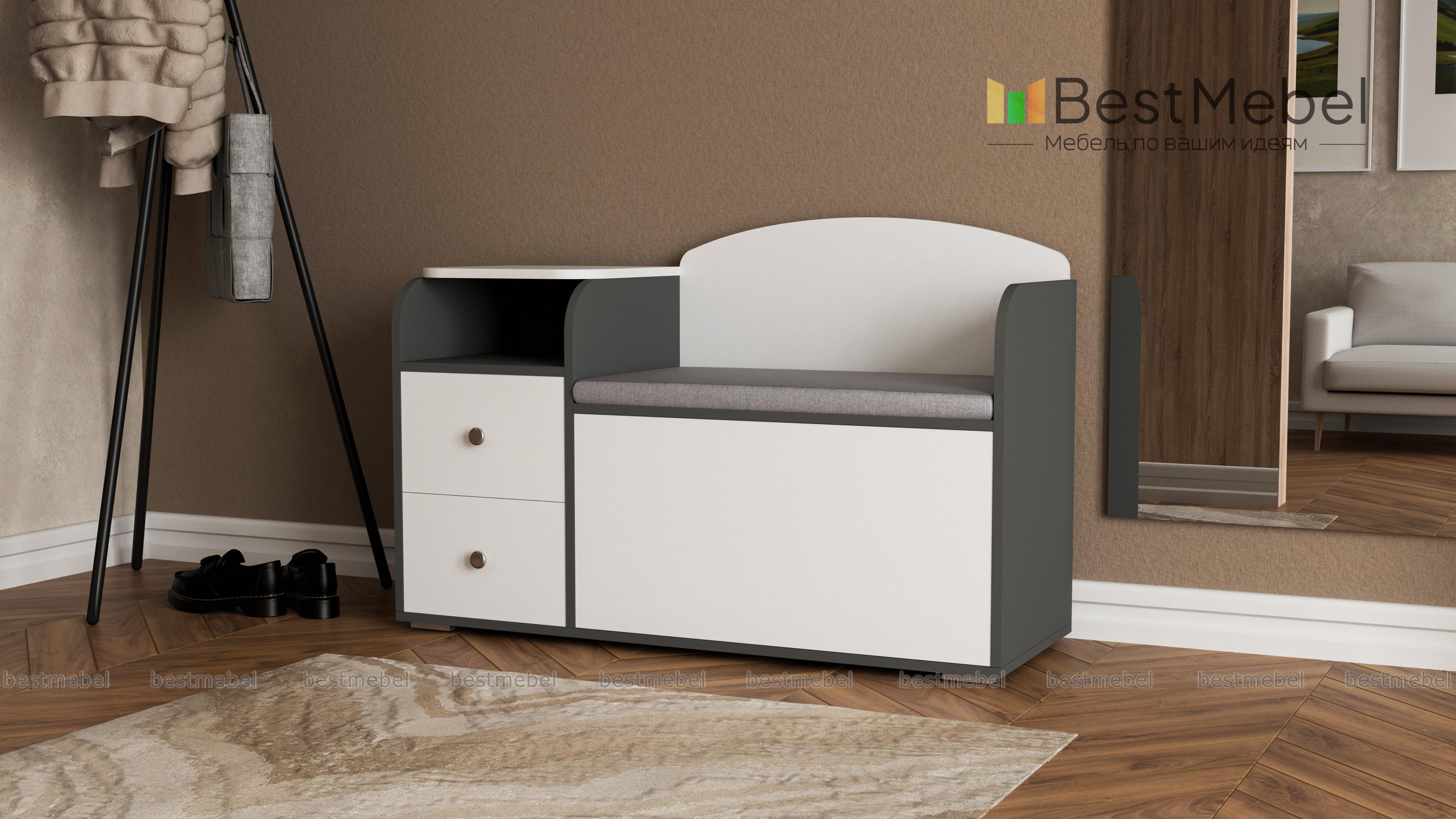 Тумба для обуви классная.Очень симпатично смотрится. Удобная и вместительная.Сидушка мягкая экокожа светлая.