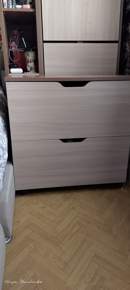 Отличная тумба. Собирается легко. Брала для хранения ниток. На верхний ящик пришлось установить магнит, так как кот очень легко его открывает и спит в нем))). Мой косяк в том, что нужно было глубину делать больше. Не все нитки влезли)))