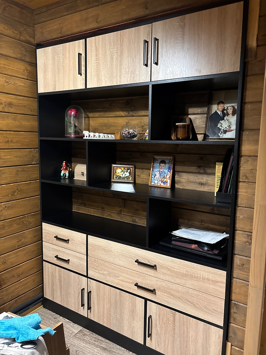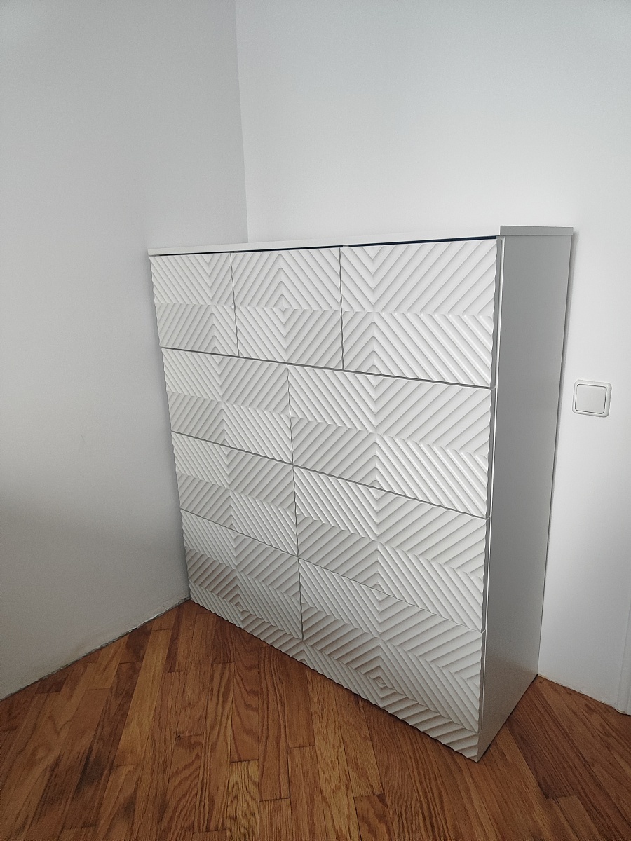 Собрали комод, который сами для себя придумали на основе имеющихся образцов с 9-ю выдвижными ящиками. Фасады с фрезеровкой выполнены и подогнаны очень хорошо. Рисунок был сложный, но все совпало и получилось очень красиво. Отдельное спасибо за нижнюю планку фасада на цоколь- получился единый рисунок и современный внешний вид. Есть замечания по глубине ящиков,  т.к. в собранном виде ящики не доходят до задней стенке на 6 см. Как-то этот момент не согласовали. Думаю, сто можно было на 5 см точно увеличить глубину ящиков, что было бы функциональнее, т.к. комод это не только фасад, но и шкаф для вещей, постельного белья и Эти 5см я учитывала  при  выборе размера комода.  Если проблема в фурнитуре, то можно было это обсудить. А так, нам теперь с этим жить. Ещё сборка тоже в некоторых местах не продумана ( центральные внутренние отверстия под симметричные направляющие почему-то одно сквозное. Получается, что направляющие  с одной стороны прикрутили, а потом с другой стороны центральной стойки в те же отверстия нужно прикручивать  с другой стороны направляющие. Шурупы ломаются друг о друга и конструкция кривая. Пришлось подгонять самим. Не хватило  2-х больших шурупов для сборки корпуса. Думаю, что лучше больше класть, чем меньше. Это уже 2-й наш большой заказ. В любом случае большое спасибо, что Вы воплощает наши мечты! Отдельное огромное спасибо инженеру-конструктору и мастеру по внешнему виду фрезеровки. Получилось ОГОНЬ!