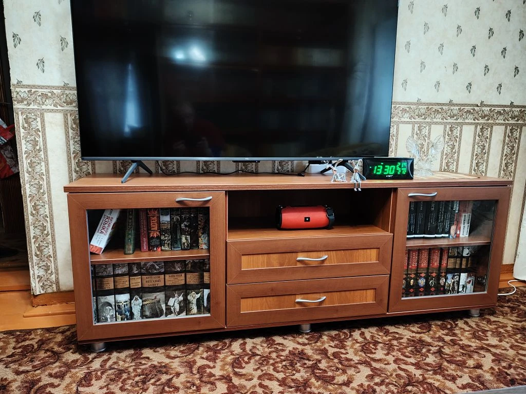 Заказывал тумбу. Под телевизор и для книг. 1720*620*400. Все отлично. Телевизор 55. Книги высота 24 мм встали. Единственно с цветом ошибся надо было просто орех. Орех Мария Луиза слишком оранжевый.