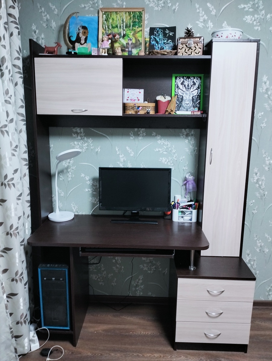 Заказ 00000154493. Заказала стол с пеналом Руби-1. Стол просто суперский! Очень понравилась возможность на сайте выбрать самой количество полок;  толщину столешницы, возможность добавить  выдвигающуюся полочку под клавиатуру, также можно выбрать фурнитуру, размеры, цвет. Сразу можно добавить спил под плинтус. Очень удобный сайт. И мебель очень хорошая. Поместились все школьные принадлежности, и осталось место под девичьи безделушки
